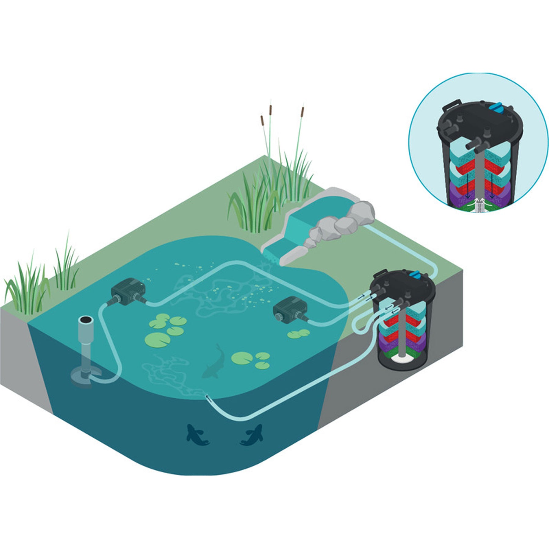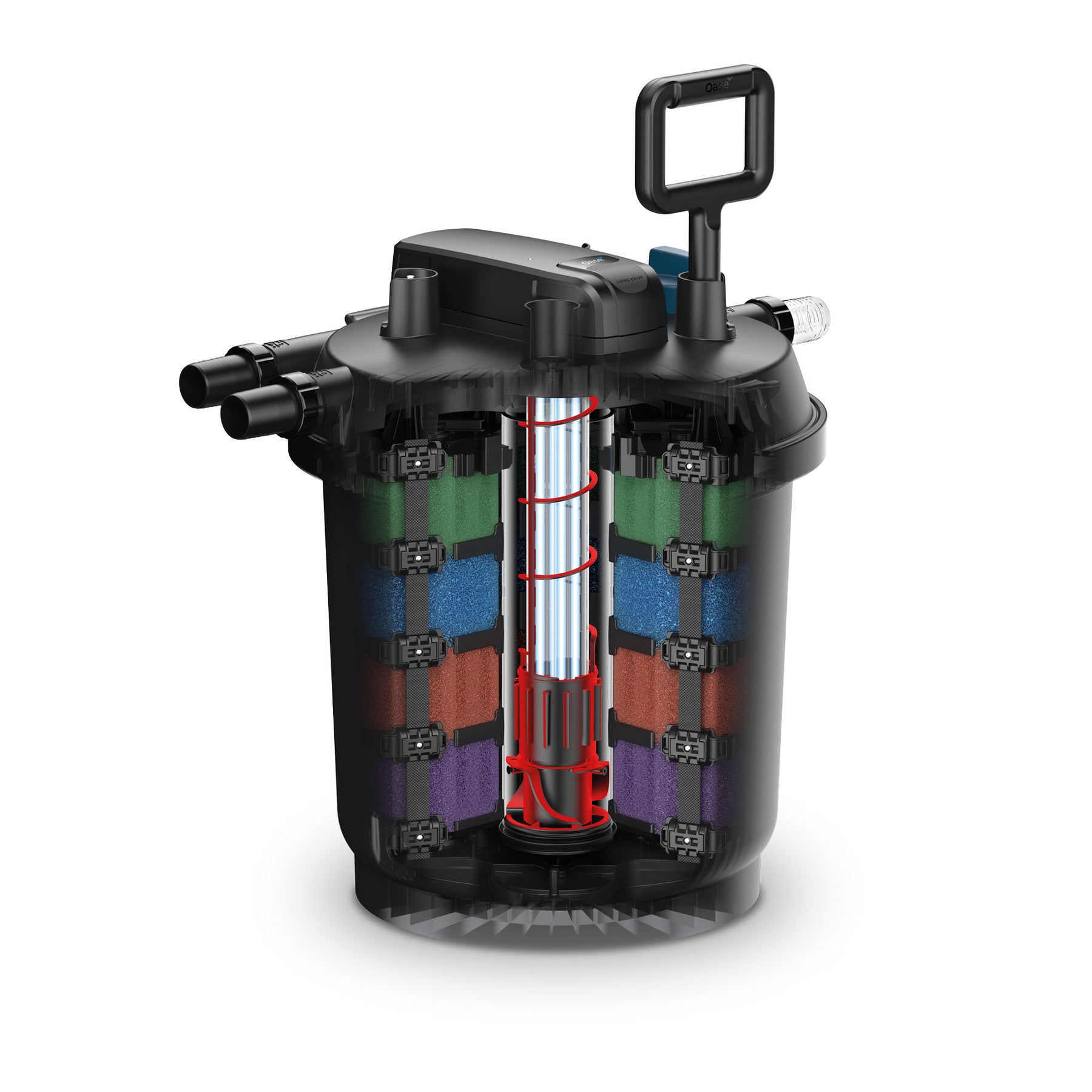 - OASE FiltoClear filters water with mechanical and biological filtration and ultraviolet clarification (UVC)