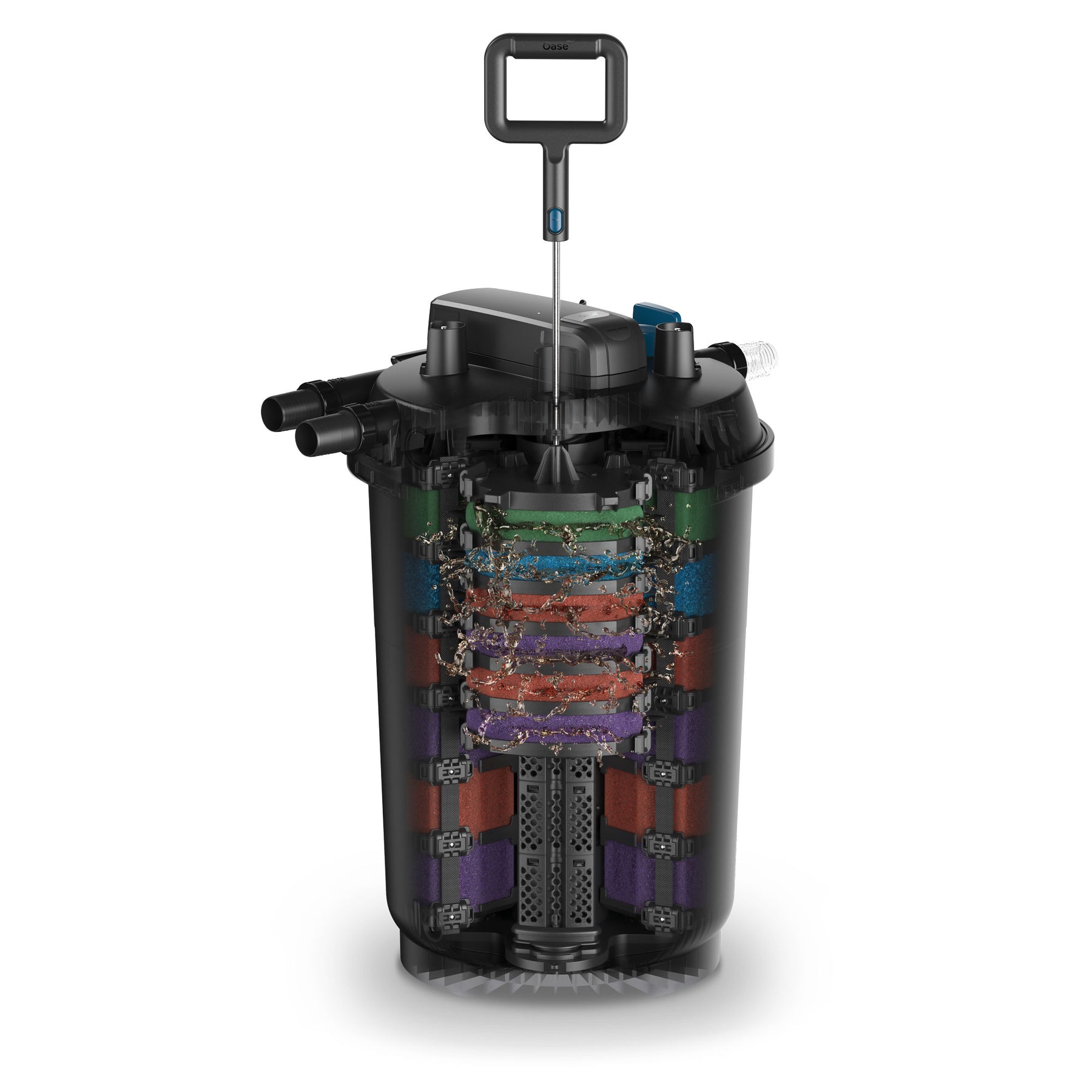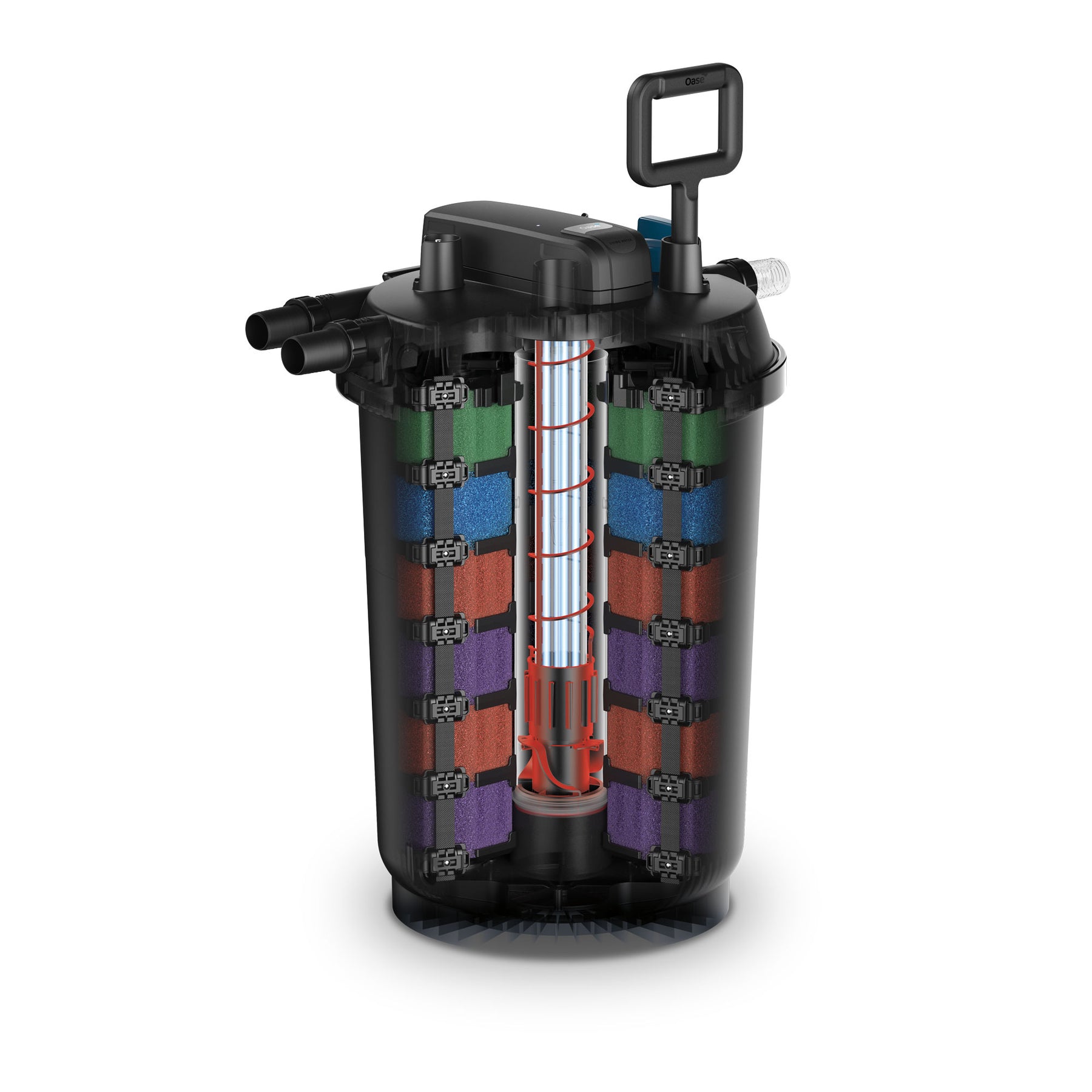 - OASE FiltoClear filters water with mechanical and biological filtration and ultraviolet clarification (UVC)